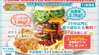 【表参道店 11月&平日限定】テラモンスターバーガーチャレンジ開催! 25年連続ハワイベストバーガー賞受賞のハワイ生まれのプレミアムバーガーショップ「テディーズビガーバーガー」原宿表参道店では受賞記念企画として、総重量3.2kgの超巨大バー...
