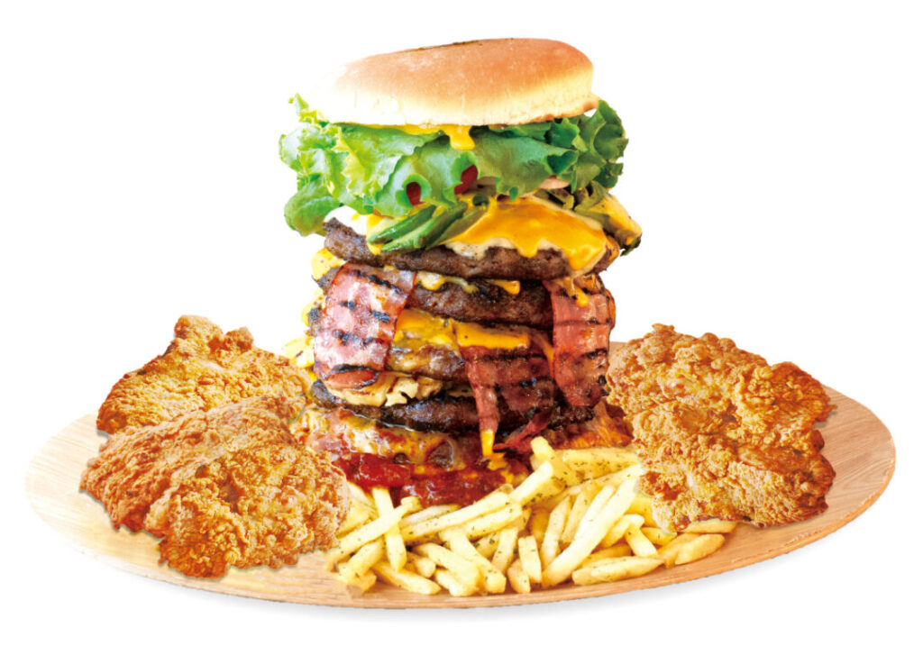 ビーフパティ1.8kg、BIGチキン5枚&ポテト付き、総重量約3.2kgのという驚異のボリュームを誇る“テラモンスターバーガー”を、25分以内に完食できれば無料!
